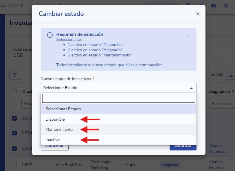 Selecciona el nuevo estado al que necesitas que cambien los activos y haz clic en Guardar.