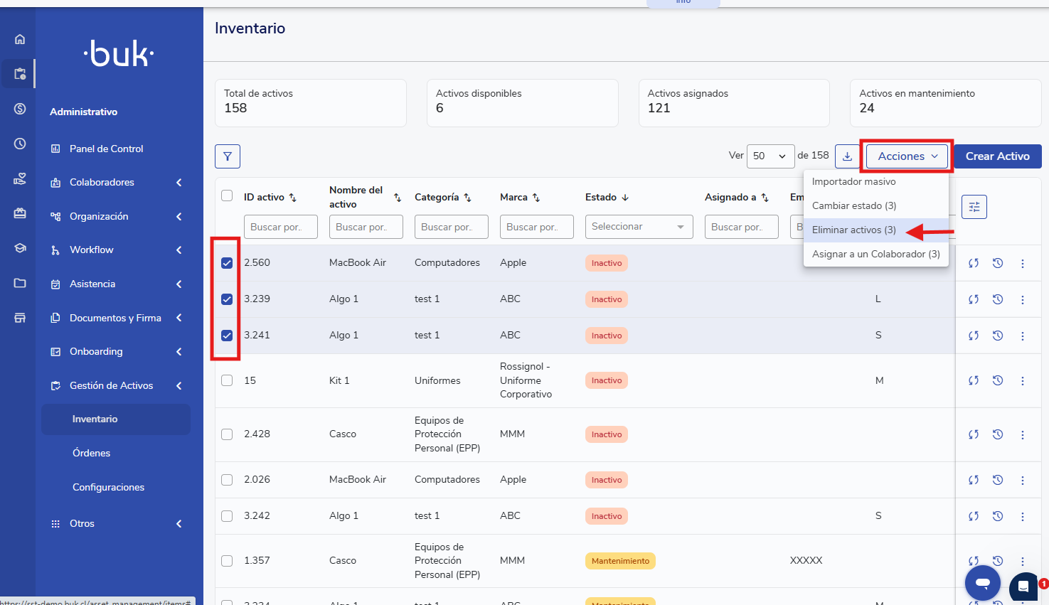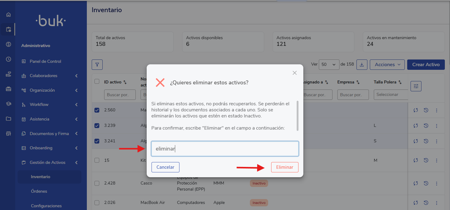 Esta acción ahora se puede realizar masivamente, permitiéndote eliminar varios activos en estado "Inactivo" simultáneamente desde el inventario.