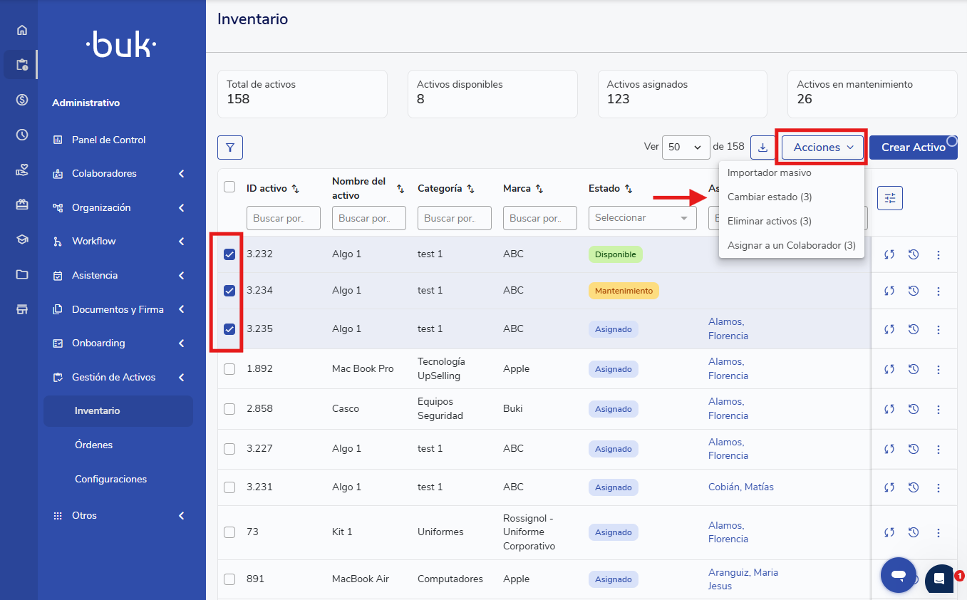 Selecciona los activos a cambiar de estado y haz clic en Acciones > Cambiar Estado.
