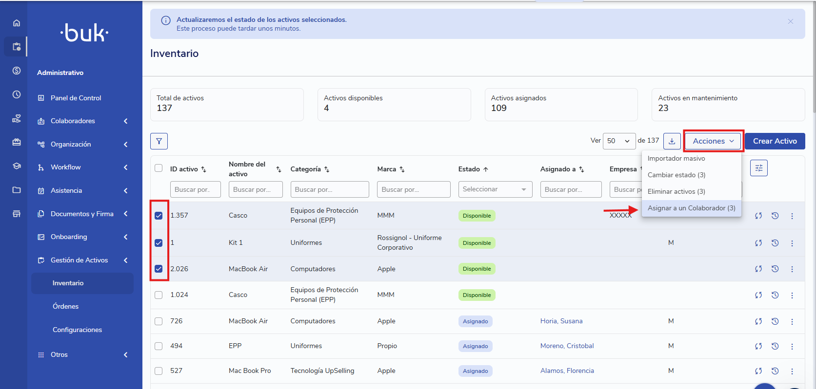 Selecciona los activos a asignar y haz clic en Acciones > Asignar a un Colaborador.