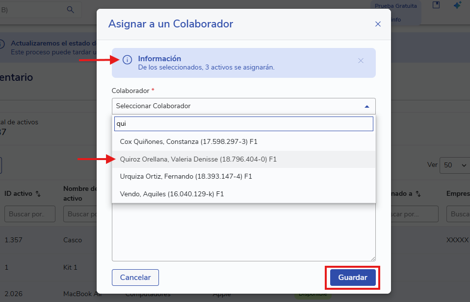 Aparecerá un cuadro informando la cantidad de activos que se asignarán y en el que podrás elegir a quién asignarás los activos. Selecciona y haz clic en Guardar.