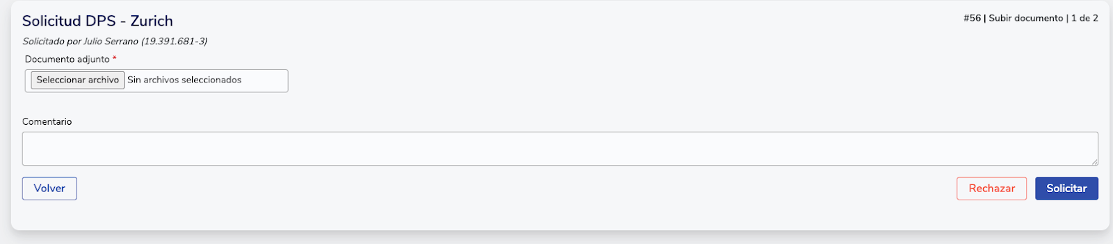 Al dar click en el enlace “Ver Solicitud”, se redirige a la siguiente vista dentro de Buk, donde debe subir el archivo solicitado, llenado con la información necesaria y firmado.