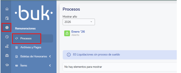 En el menú lateral de Buk, ve a Remuneraciones y luego a Procesos.