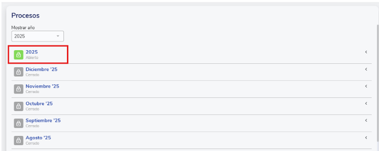 Asegúrate de tener seleccionado el año correspondiente (ej. 2025). Para generar la variable anual, debes tener todos los meses de ese año en estado Cerrado.