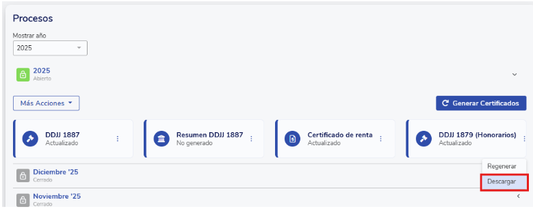 Una vez que aparezcan las opciones, haz clic en DDJJ 1879 (Honorarios) para generar y descargar el archivo.