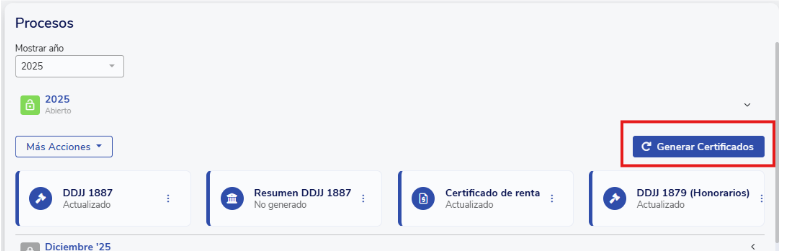 Posiciónate en la variable anual (ej. 2025) y haz clic en el botón "Generar Certificados".