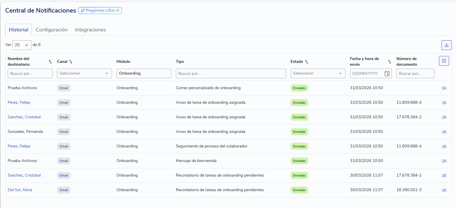 Para hacer seguimiento a los correos que salen desde Onboarding, entra al Historial de notificaciones y filtra por el módulo Onboarding.
