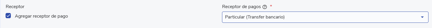 - En la sección Opciones avanzadas, selecciona Agregar receptor de pago. Aparecerá un campo llamado Receptor de Pagos, en donde deberás seleccionar Particular (Transfer Bancario) en la lista desplegable.