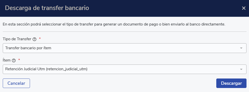- Desde el menú lateral Remuneraciones, sección Procesos, archivo Otros Pagos del mes en que quieras hacer el pago, podrás descargar el archivo de pago, seleccionando tipo de Transfer bancario por ítem. Selecciona el ítem de retención judicial asignado.