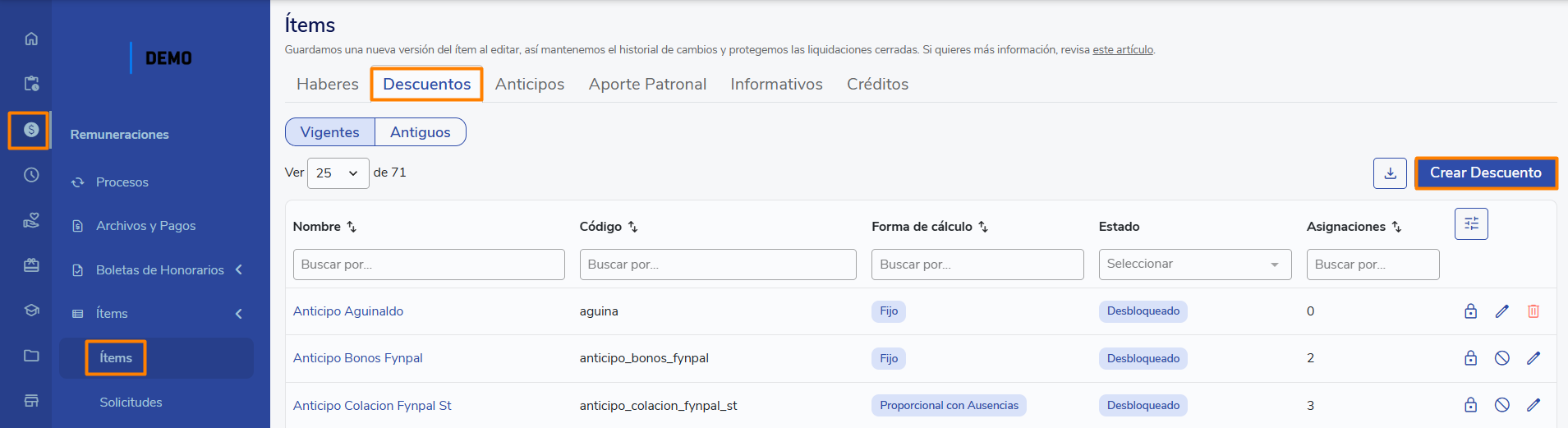 Accede al menú lateral Remuneraciones y luego haz clic en Ítems. Ingresa a la pestaña Descuentos y allí haz clic en el botón Crear descuento.