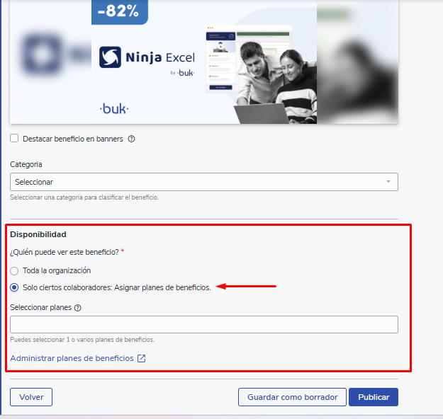 3.- Quitar el check de la opción “Beneficio Disponible para toda la Empresa” y asignar un Plan (recuerda que deberás tener creado tu plan previamente).