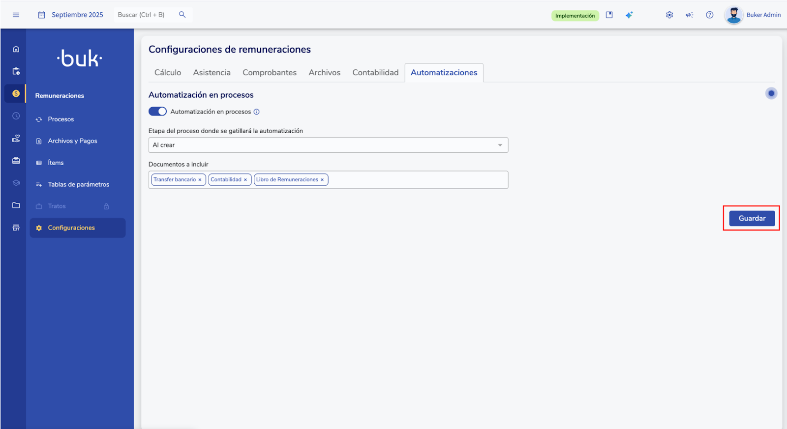 Configura la generación automática de tus archivos según la etapa de tu proceso (al crear, en revisión, al cerrar) directamente desde el menú de Configuración de Remuneraciones.