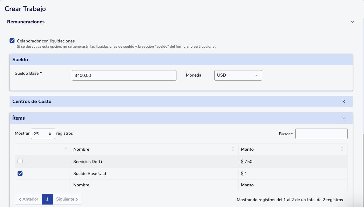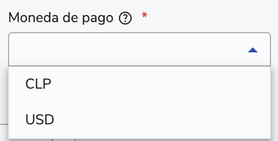 En Moneda de pago, selecciona USD. Es fundamental realizar esta selección para habilitar la creación del trabajo internacional.