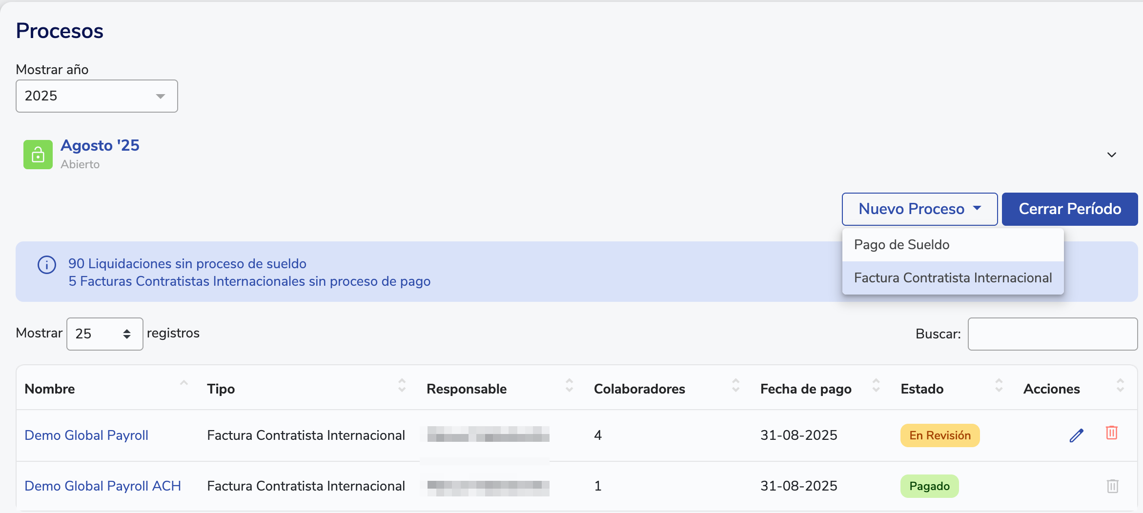 Haz clic en Nuevo Proceso y selecciona Factura Contratista Internacional.