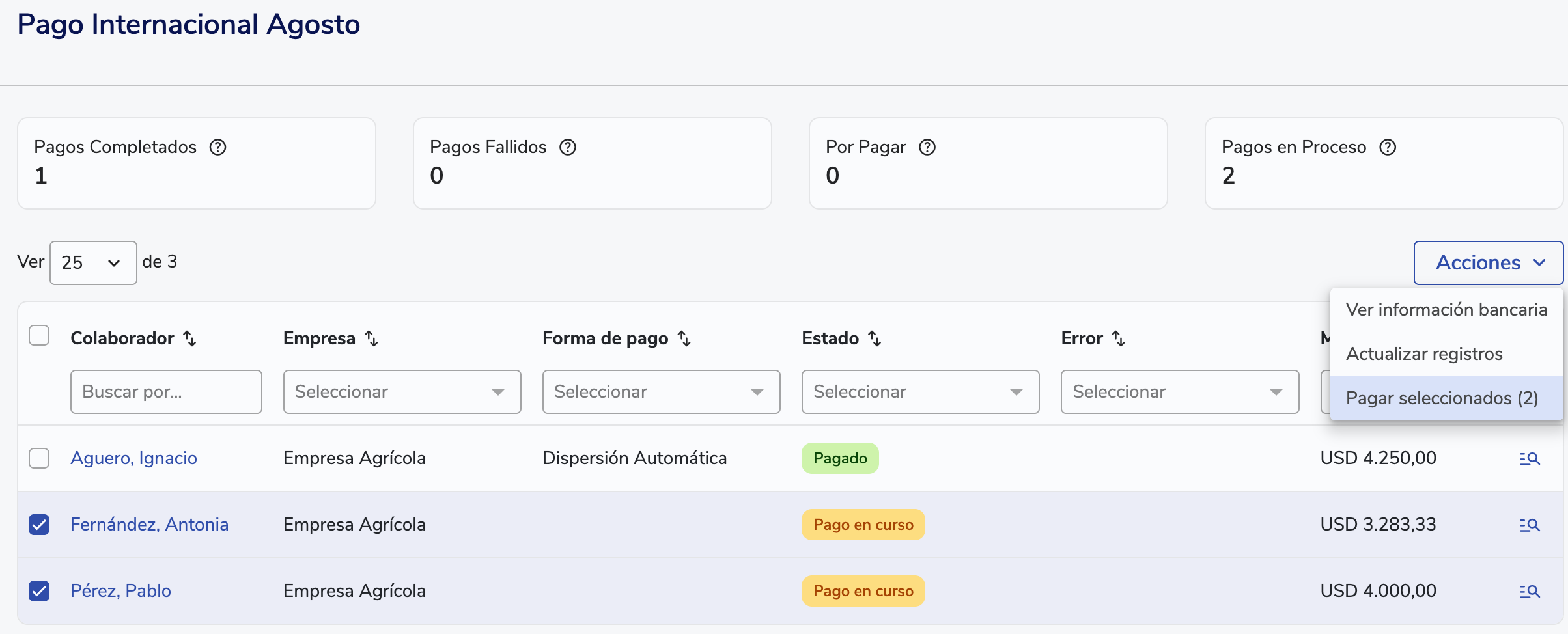 Selecciona a los colaboradores y haz clic en Pagar seleccionados para ejecutar la transacción masiva vía SWIFT o ACH.