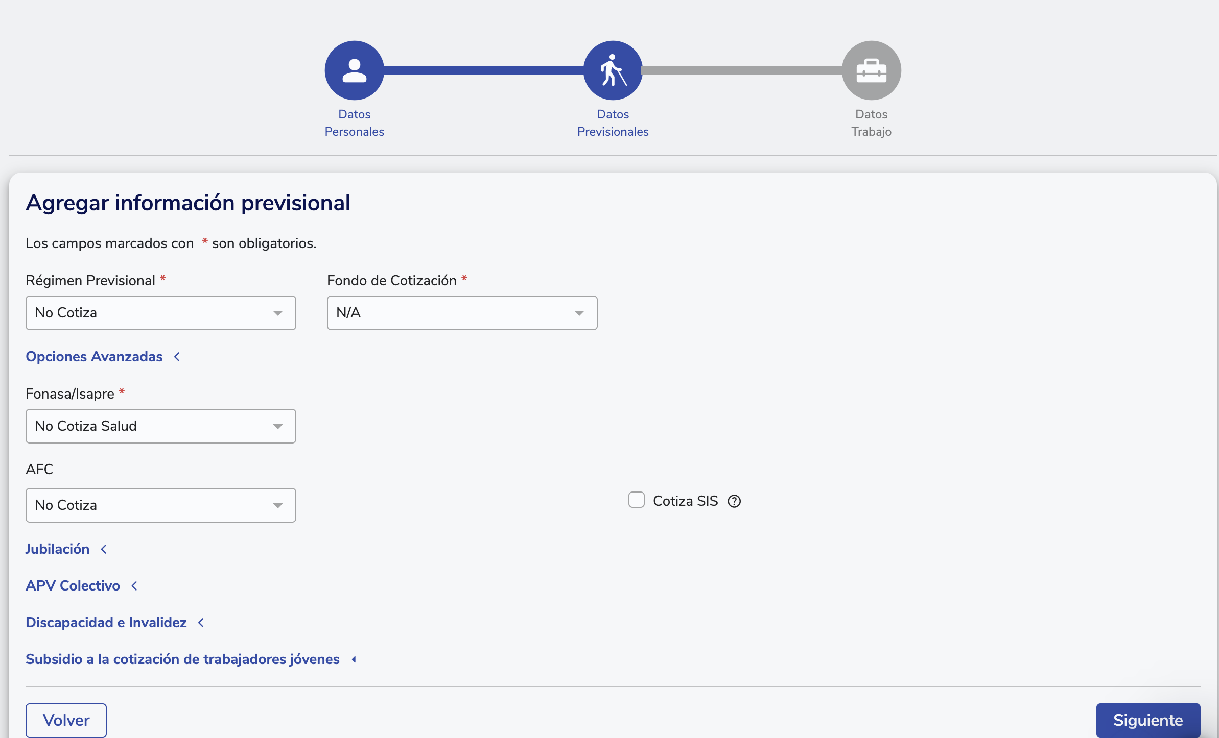 En el paso de Información Previsional, selecciona No Cotiza en todos los campos obligatorios.