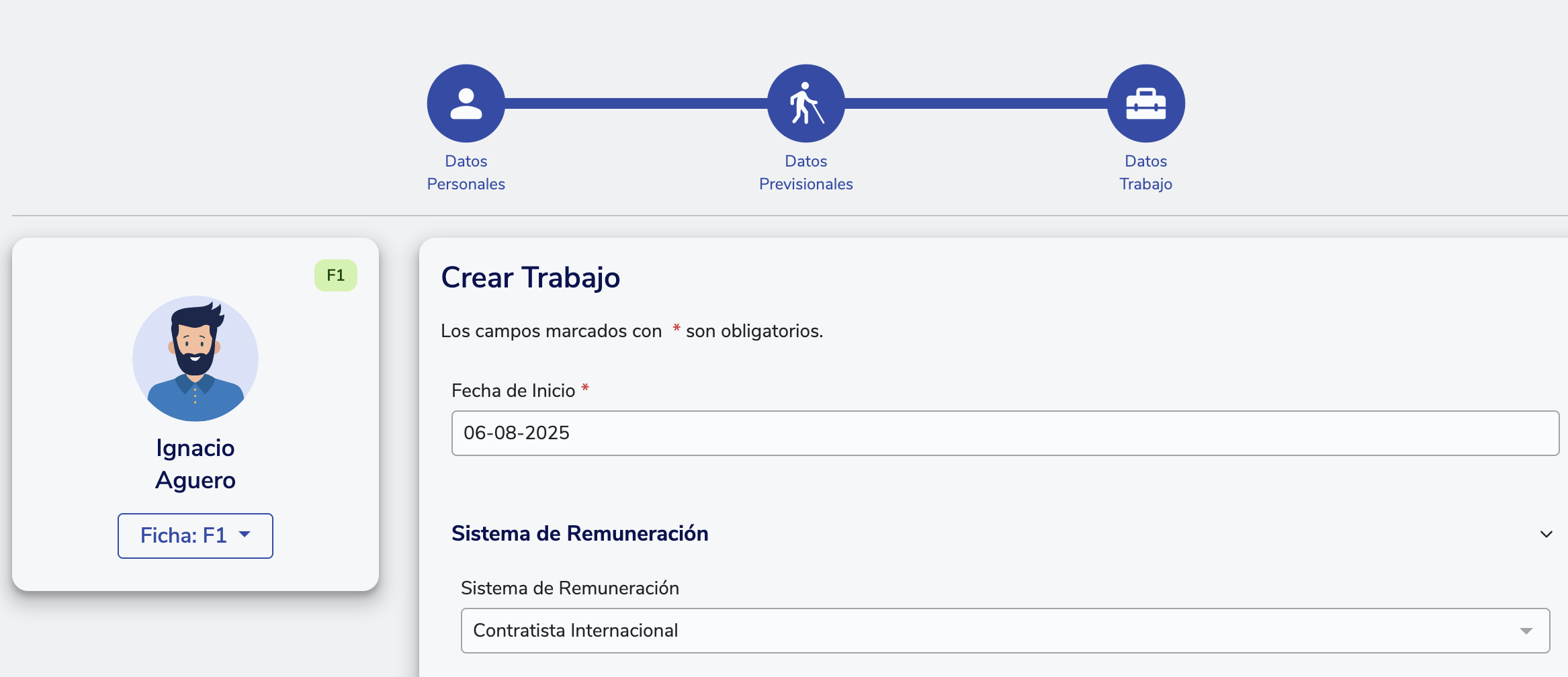 Finalmente, al completar los Datos Trabajo, elige el Sistema de Remuneración como Contratista Internacional y define el Sueldo Base del colaborador.