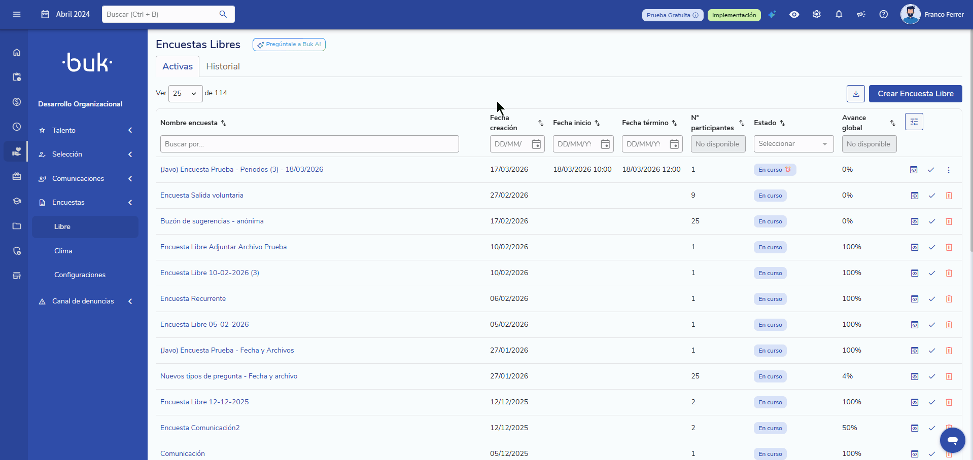 Dirígete a Desarrollo Organizacional> Encuestas > Libres.