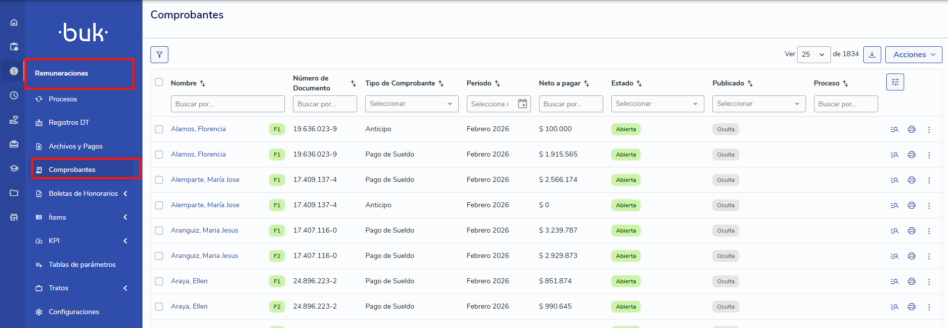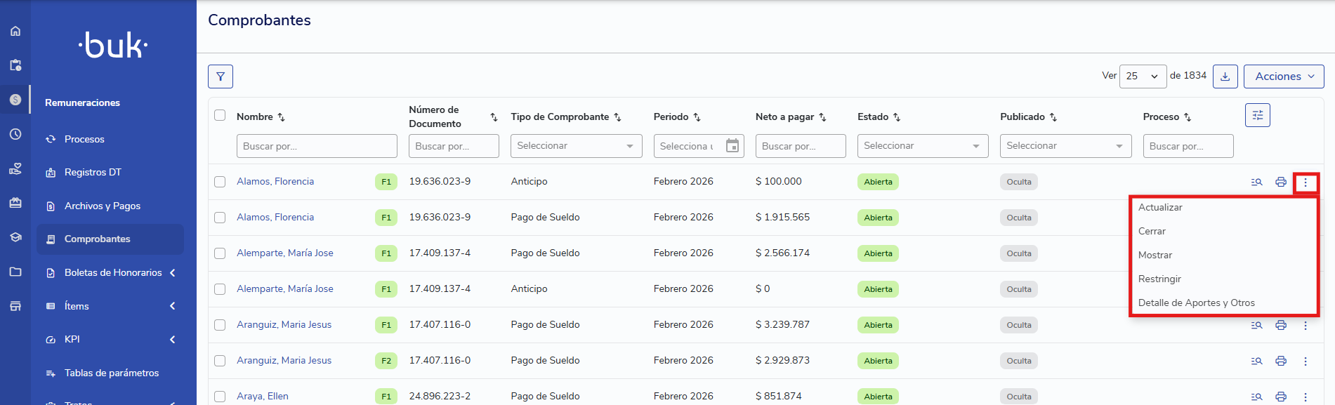 Visibilidad de columnas: Puedes personalizar tu vista desde el menú de configuración de la tabla, mostrando u ocultando columnas como "Neto a pagar" o "Proceso".