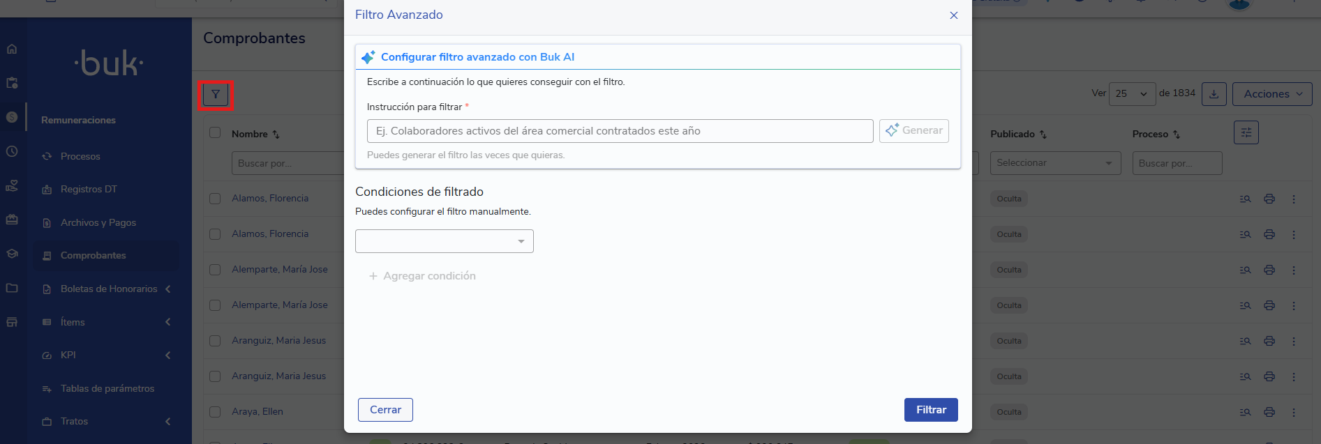 Filtrar información: Usa el Filtro Avanzado para buscar por nombre, DNI, área, cargo o tipo de contrato.