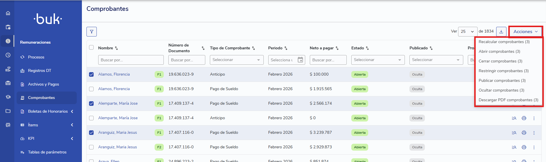 Gestiones masivas: Selecciona uno o varios comprobantes y utiliza el botón Acciones para: