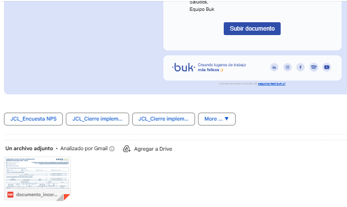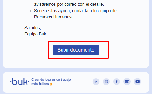- Recordatorios automáticos: Si no subes el archivo, Buk te enviará correos recordatorios semanalmente de forma automática.
