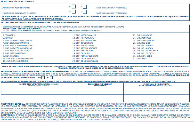 No olvides completar la declaración de salud tanto tuya como la de tus cargas aseguradas (Conyugue/Hijos), en caso que tu como titular no tengas enfermedades pero tus cargas aseguradas si, las debes indicar en esta sección.