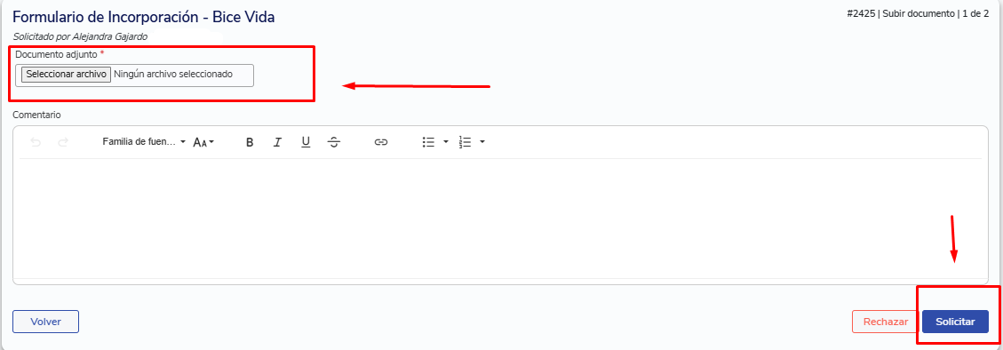 - Finaliza la entrega: Sube el documento firmado y presiona "Solicitar".