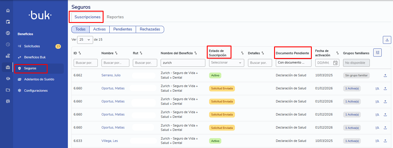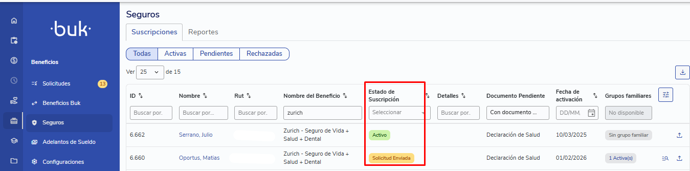 Cuando la aseguradora procese el documento, el estado se actualizará automáticamente en Buk: