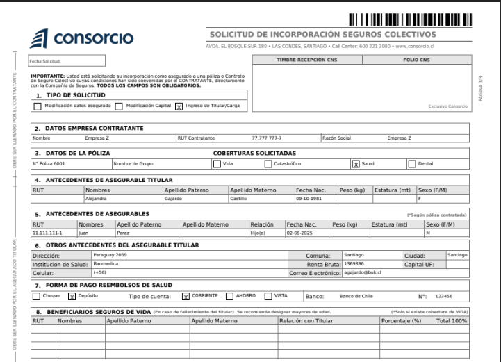 La Solicitud de Incorporación es el documento formal y obligatorio que permite a la aseguradora Consorcio revisar la información de tus colaboradores y la de sus cargas aseguradas (en caso que la póliza los incluya), para gestionar el alta del seguro.