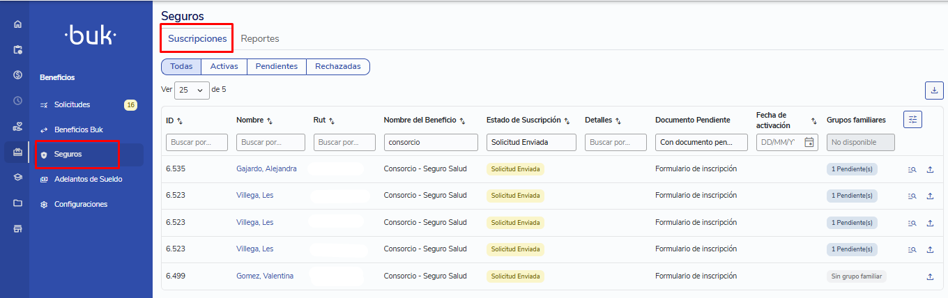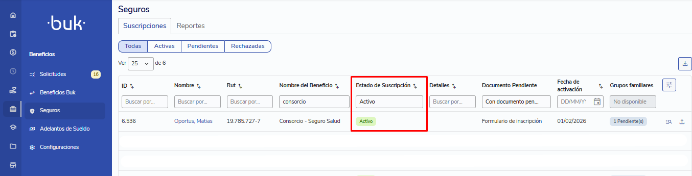 Cuando la aseguradora procese el documento, el estado se actualizará automáticamente en Buk: