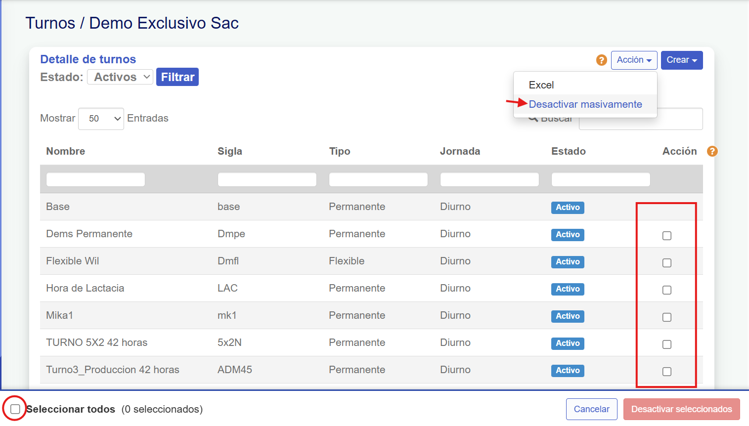 Puedes elegir todos los turnos disponibles o simplemente un grupo específico según tus necesidades. Una vez que hayas realizado la selección, tendrás la opción de desactivarlos de forma masiva.