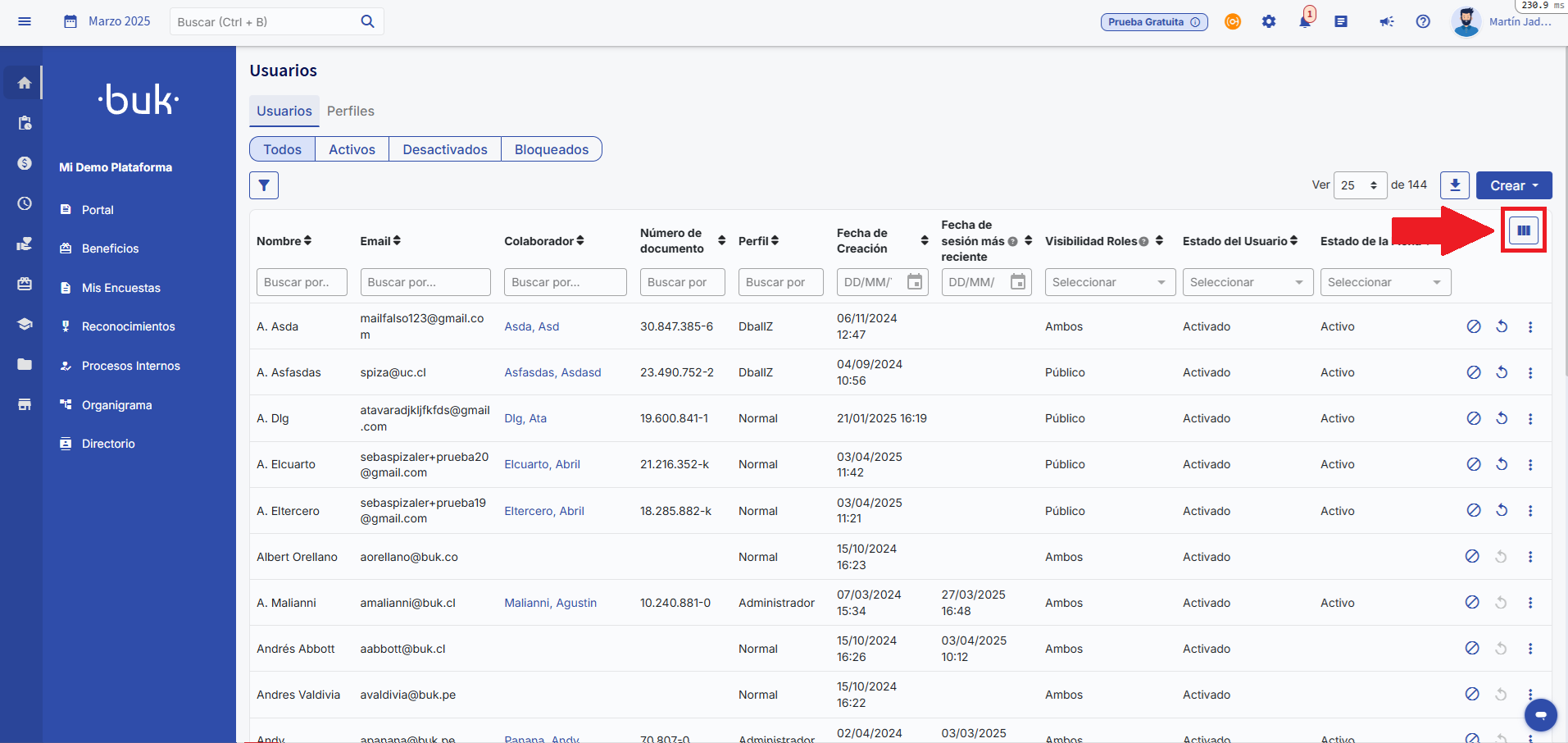 - Data de ativação:Corresponde à última vez em que o estado do usuário foi alterado paraAtivo