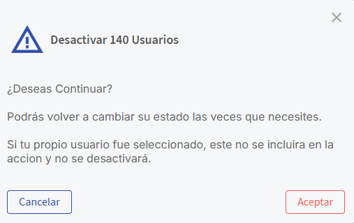 Cada vez que você realizar uma dessas ações, será exibido ummodal de confirmação, onde você poderá revisar os usuários selecionados antes de aplicar as alterações.