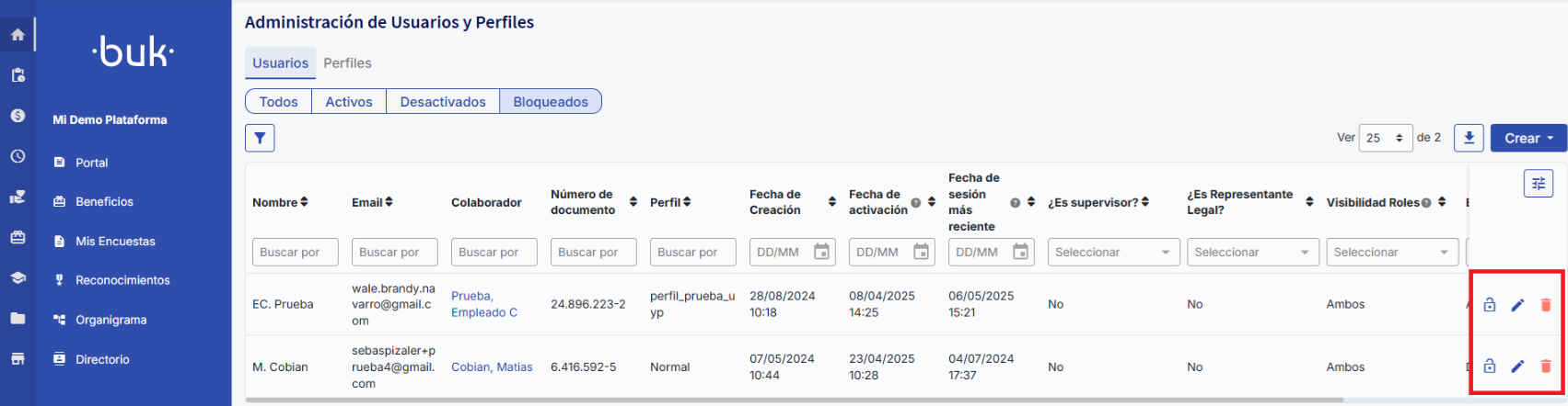 Para gerenciá‑los, dirija‑se à aba“Bloqueados”dentro do móduloUsuários e Perfis.