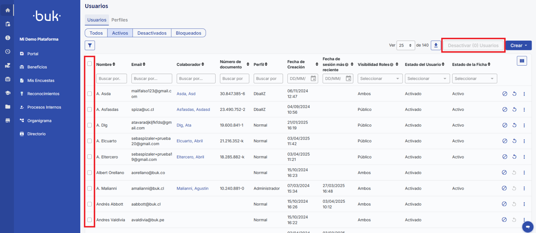 Nas abasAtivoseDesativadosvocê pode selecionar um ou vários usuários marcando acaixa de seleção que aparece à esquerdade cada linha. Em seguida, clique no canto superior direito para realizar a ação.