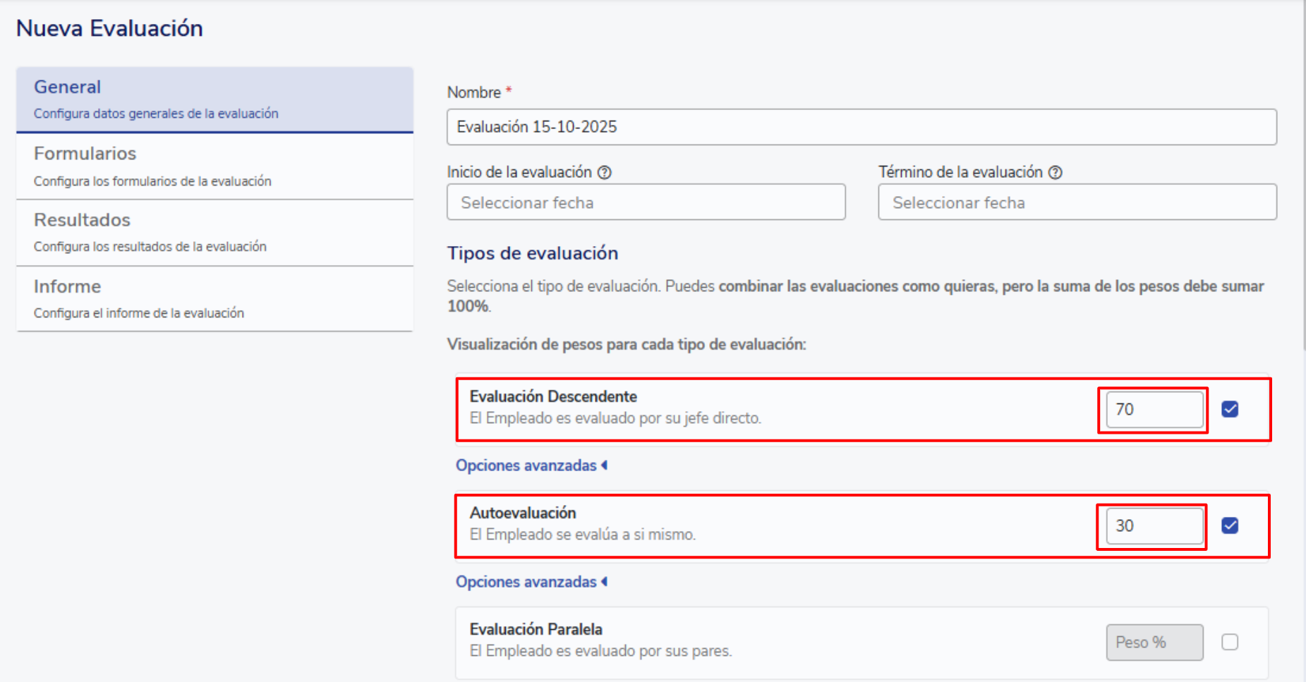 No nosso exemplo, a avaliação foi configurada apenas com avaliação descendente e autoavaliação, atribuindo-lhes pesos de 70% e 30%, respetivamente.