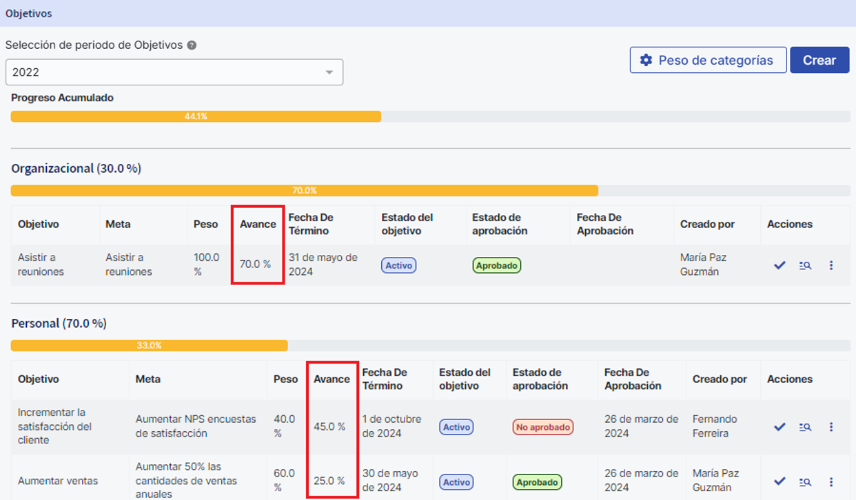 Essa funcionalidade possibilita o acompanhamento dos objetivos ao permitir que colaboradores e líderes insiram periodicamente a porcentagem de avanço diretamente em sua ficha. Ao registrar o avanço nos objetivos, será possível revisar automaticamente o progresso em relação a cada categoria e o avanço acumulado, oferecendo assim uma visão clara e atualizada do progresso realizado.