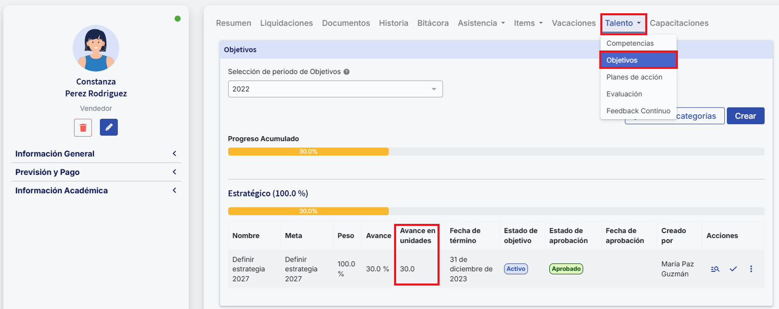 No módulo de Gestión del Desempeño, você tem a opção de registrar os objetivos/metas dos colaboradores. Tanto líderes quanto colaboradores poderão acompanhar estes diretamente a partir da ficha de cada colaborador. Além disso, você tem a possibilidade de incorporar esses objetivos e medi-los em avaliações de desempeño.