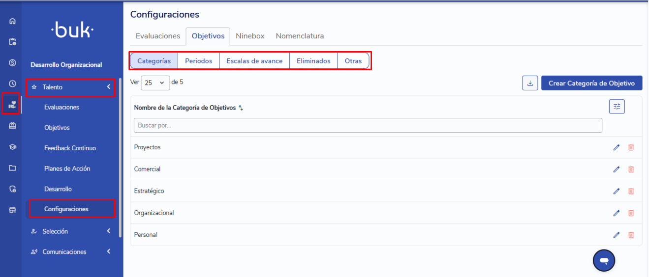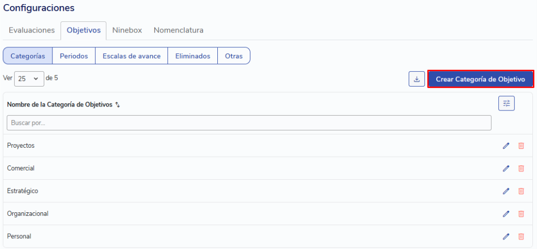 Por padrão, você encontrará as categorias "Personal" e "Organizacional". Você pode modificar os nomes dessas categorias ou excluí-las se desejar. Para criar novas categorias, clique em "Crear Categoría de Objetivo" e atribua-lhe um nome.