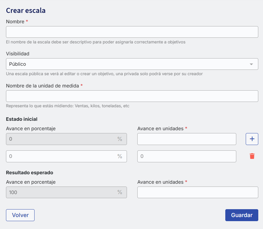 As escalas permitem gerar diferentes metodologias de cálculo para registrar o avanço dos objetivos, as quais podem ser salvas como públicas ou privadas.