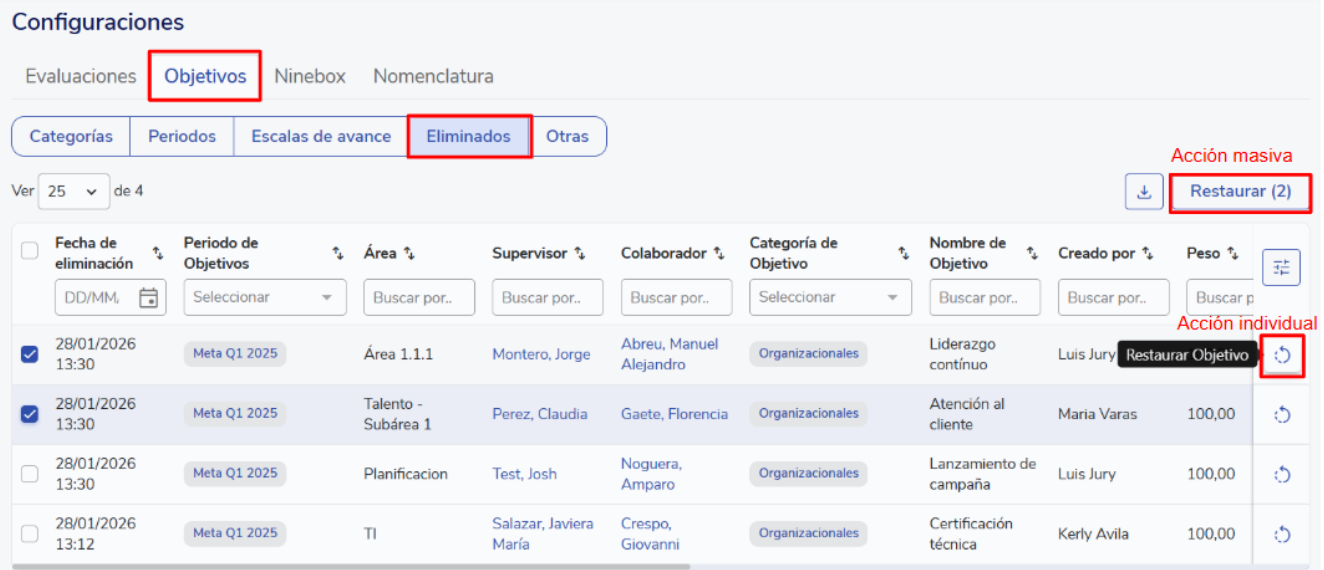 Nesta seção você encontrará uma tabela com a lista de objetivos excluídos disponíveis para restaurar de forma individual ou em massa. Todos os objetivos excluídos, tanto por exclusão individual, em massa ou por sobrescrita, passarão automaticamente para esta seção. Uma vez restaurados, os objetivos voltarão a estar disponíveis para edição, atualização ou exclusão. É importante considerar que, se o colaborador, período, categoria ou escala associada foi excluído, o objetivo não poderá ser recuperado; e se um atributo personalizado foi excluído, o objetivo será restaurado sem a informação histórica desse atributo.