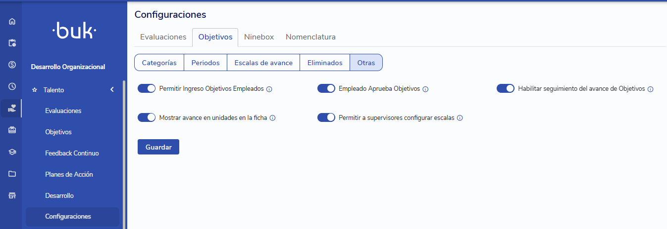 A partir da seção de Configuraciones, você deverá configurar as categorias, os períodos relacionados aos objetivos, as escalas de avanço ou outras configurações.
