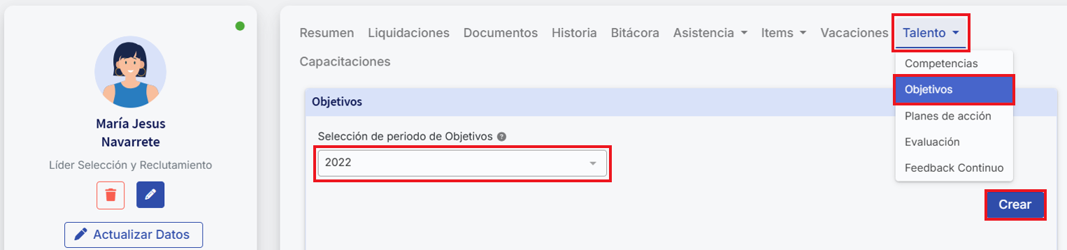 Com esta opção, os colaboradores têm a capacidade de inserir seus próprios objetivos a partir de sua ficha na seção de "Talento" na aba "Objetivos". No entanto, é importante destacar que esses objetivos devem ser aprovados pelos seus supervisores. Caso essa função não esteja habilitada, os colaboradores não visualizarão o botão "Crear". Além disso, os colaboradores têm a opção de notificar seus supervisores no momento de criar seus objetivos. Isso gerará um e-mail com um link direto para que os supervisores o revisem, facilitando assim o processo de aprovação diretamente desde a ficha do colaborador.