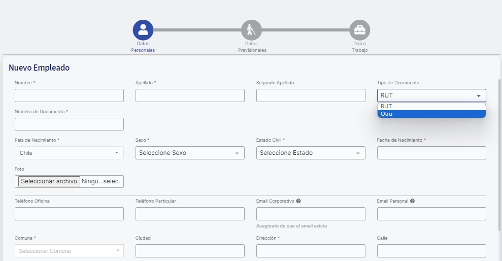 No campo "Número do Documento", insira o número de identificação do colaborador. Quanto ao "Tipo de Documento", você pode selecionar RUT ou escolher a opção "Outro" para incluir pessoas estrangeiras. A última opção permite inserir números de documentos de qualquer país e manter informações precisas na plataforma. É importante observar que, ao selecionar a opção "Outro" em "Tipo de Documento", o campo "Número do Documento" não estará sujeito à validação e aceitará apenas caracteres alfanuméricos.