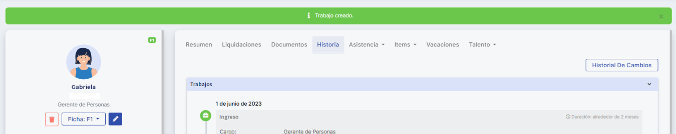Ao finalizar, o sistema confirmará que o trabalho e o colaborador foram criados corretamente.