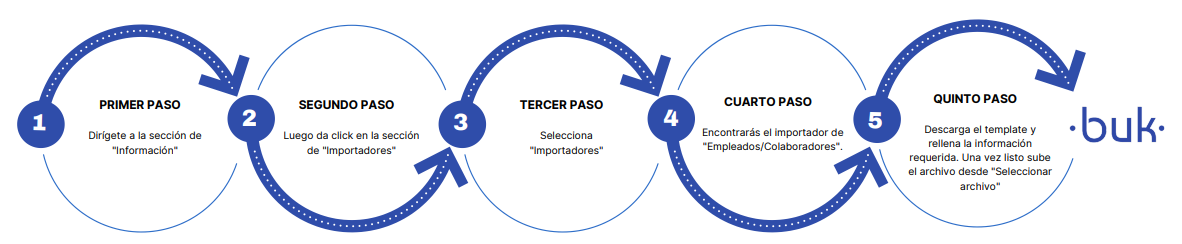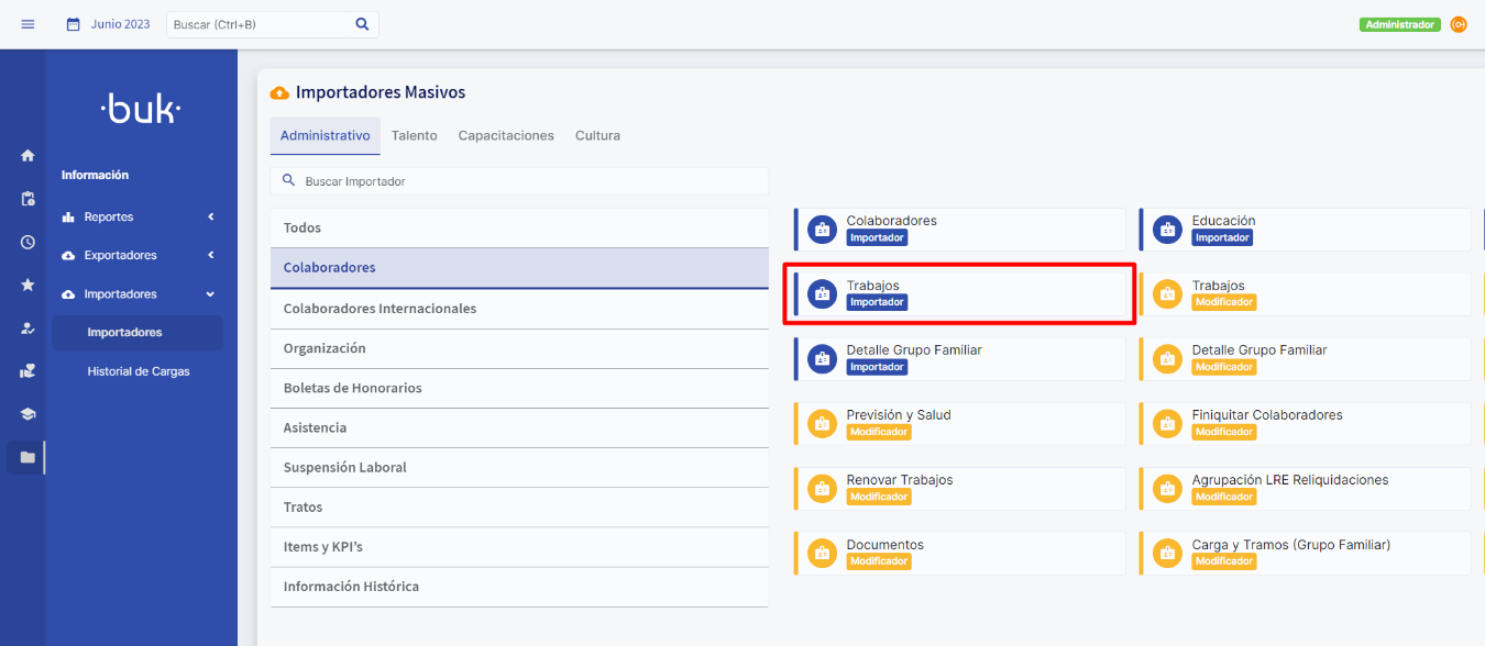 Você pode criar colaboradores de forma massiva por meio dos importadores da Buk. Para isso, vá até a seção "Informações" e selecione "Importadores". Clique novamente em "Importadores" e aí encontrará o importador "Colaboradores". A partir daí, você pode carregar as informações pessoais e de seguridade social do colaborador. O sistema confirmará que o trabalho e o colaborador foram criados corretamente ao concluir esse processo.