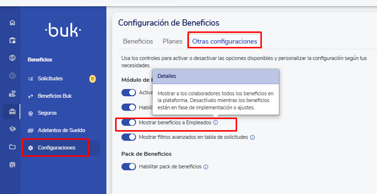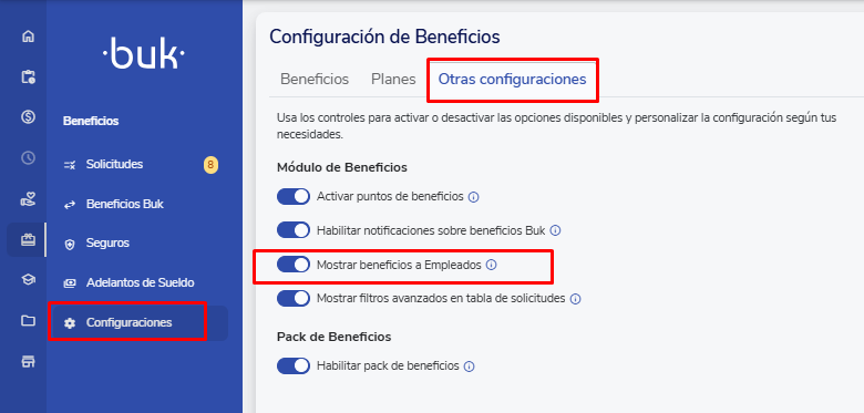 Para configurá-lo, dirija-se à barra lateral esquerda e selecione:Beneficios > Configuraciones > Outras configuraciones. Lá você encontrará a opçãoMostrar beneficios a empleados, onde você poderá gerenciar esta funcionalidade.