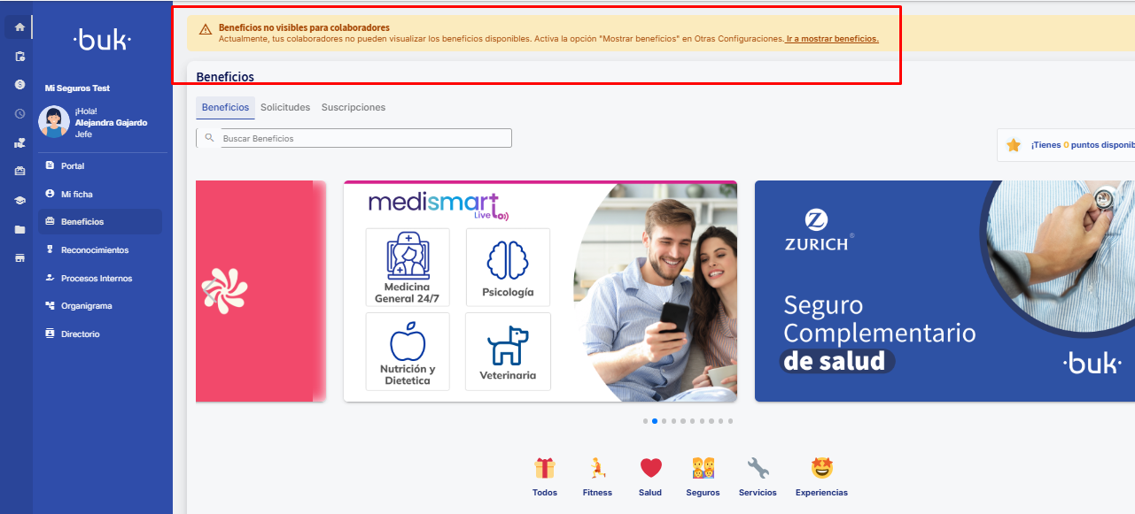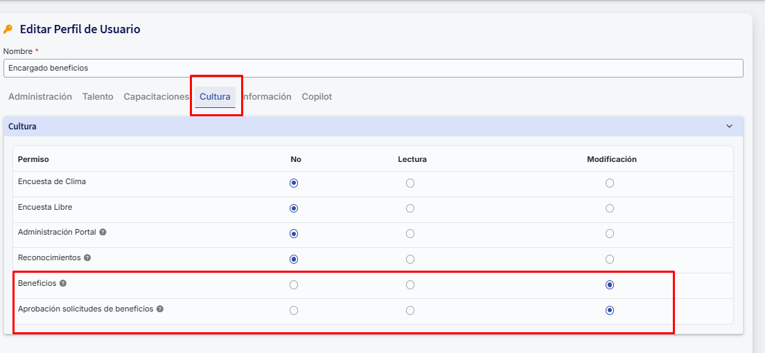 Lembre-se de que os benefícios serão ocultados para quem não tiver um usuário com permissões de edição de Beneficios; caso tenham acesso a “Modificación” de benefícios, não serão ocultados para esses usuários.