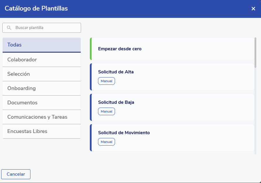 Crie um novo modelo. Vá paraAdministrativo > Workflow > Modelose selecione "Criar Modelo". Você também pode modificar uma plantilla de Alta existente.